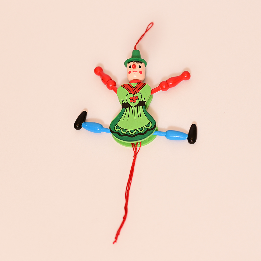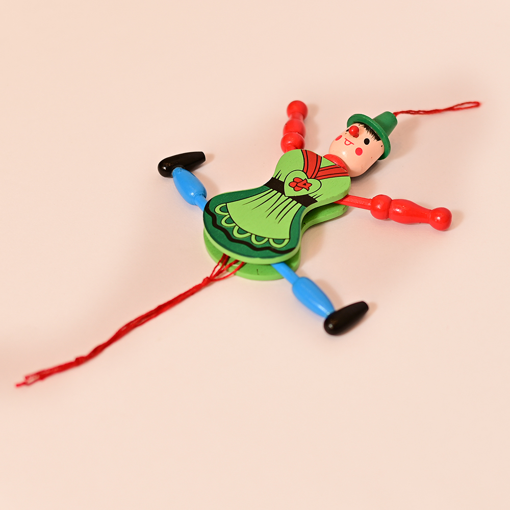 Design: Colorful wooden doll with pull-string mechanism for moving arms & legs