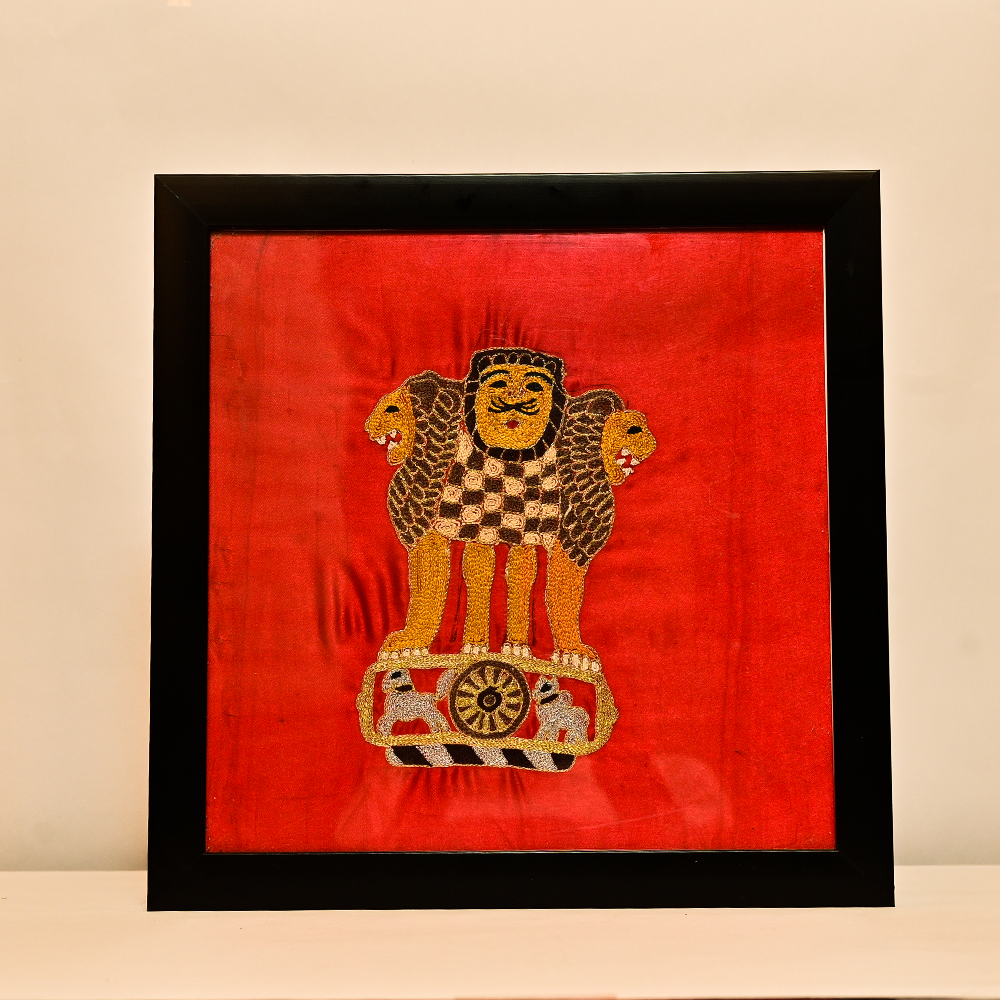 The artwork is carefully mounted in a sleek black wooden frame, making it a distinguished piece for homes, offices, government spaces, and gifting. Each stitch reflects the craftsmanship of skilled artisans, making it not just décor but a piece of Indian legacy.
