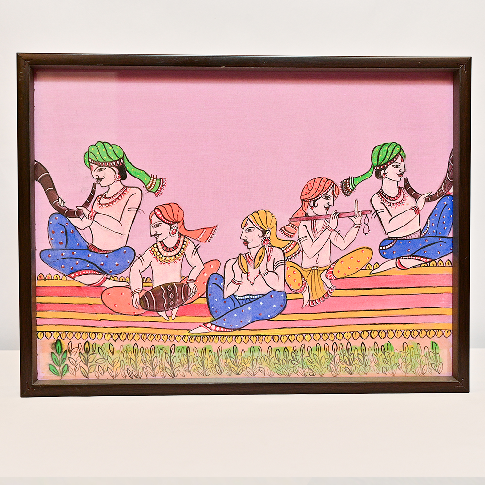 Celebrate the rhythm of culture with this handmade folk art painting, beautifully illustrating traditional musicians playing instruments. With its vibrant colors and intricate brushwork, this artwork brings to life the festive charm and storytelling essence of Indian traditions.