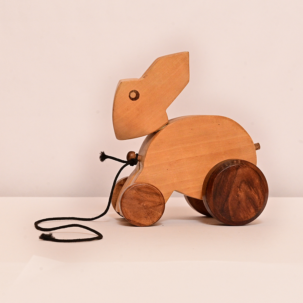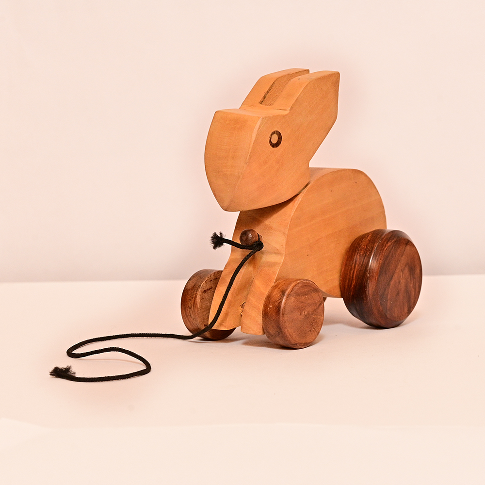 Let your child hop into the world of fun with this handcrafted wooden rabbit pull toy. Designed in a cute rabbit shape, this eco-friendly toy encourages imaginative play while improving motor skills. Its smooth wooden finish, sturdy wheels, and pull-along string make it both safe and engaging for little ones. It also doubles up as a lovely décor collectible.